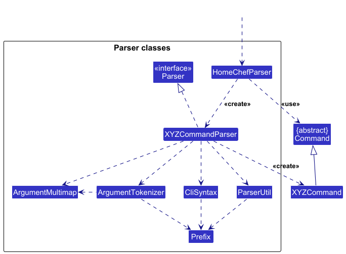 HomeChefParserclass creates anXYZCommandParser(XYZis a placeholder for the specific command name e.g.,AddCommandParser) which uses the other classes shown above to parse the user command and create aXYZCommandobject (e.g.,AddCommand) which theHomeChefParserreturns back as aCommandobject. - All